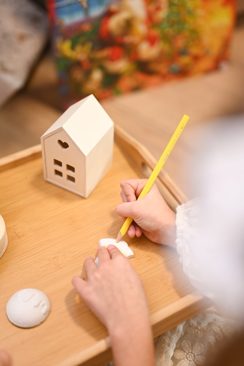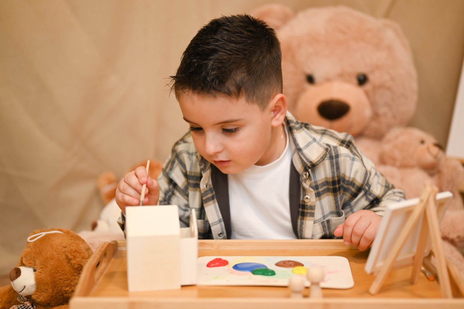Cel de-al treilea decor a fost Atelierul de Creație al lui Moș Crăciun, un spațiu viu, în care această sărbătoare a fost simțită prin joacă, curiozitate și descoperire. Aici, copiii au desenat, au pictat, au explorat cu mânuțele lor materiale, culori și forme, iar părinții au privit din apropiere, bucuroși să îi vadă implicați și prezenți. Atelierul a adus un alt ritm ședințelor foto, unul plin de energie, dar în același timp cald și autentic.