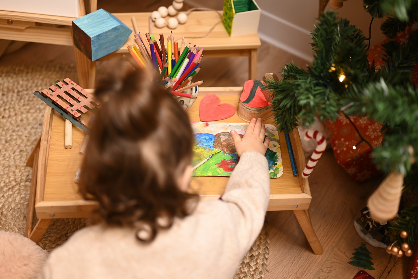 Cel de-al treilea decor a fost Atelierul de Creație al lui Moș Crăciun, un spațiu viu, în care această sărbătoare a fost simțită prin joacă, curiozitate și descoperire. Aici, copiii au desenat, au pictat, au explorat cu mânuțele lor materiale, culori și forme, iar părinții au privit din apropiere, bucuroși să îi vadă implicați și prezenți. Atelierul a adus un alt ritm ședințelor foto, unul plin de energie, dar în același timp cald și autentic.